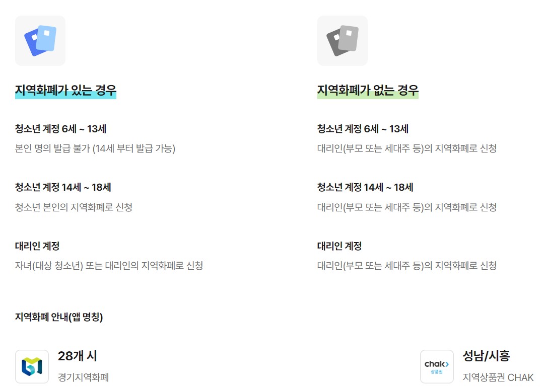 신청절차 신청사이트 : [어린이 청소년 교통비] 신규회원 가입 → 거주지 검증 → 교통카드 등록 → 지역화폐 또는 은행계좌 등록 → 자동신청 기존회원 로그인 → 매년 1분기 거주지 재검증 → 교통카드 및 지급수단(지역화폐, 지급계좌) 정보 확인 → 자동신청